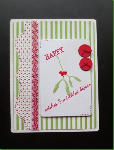 I ran into the same problem for Kissing.  The only kissing images i have are those mice under the candy canes.  Hmmm…time for the thinking cap.  This covers it nicely and even has the word kiss in the sentiment. MFT blueprints 6 and sketch.  I have all my sketches printed out and in a binder and when i need one, i decide on the blueprints i’m going to use and then flip to my sketch binder.  The candy strip is a satiny ribbon and i added faux stitching to the curved layer. The buttons are cardstock.